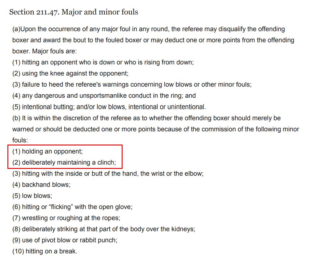 そのNYSACが、この程度の反則しか規定していない。個別具体的な反則行為について、1発減点や失格に直結する「重大な反則(Major fouls)と、直ちに処罰の対象とはならない「軽微な反則(Minor fouls)」に分けて記載されてはいるものの、「軽微な反則(Minor fouls)」の先頭に、「相手を押さえつける」,「故意による執拗なクリンチ」を置いているのみ。